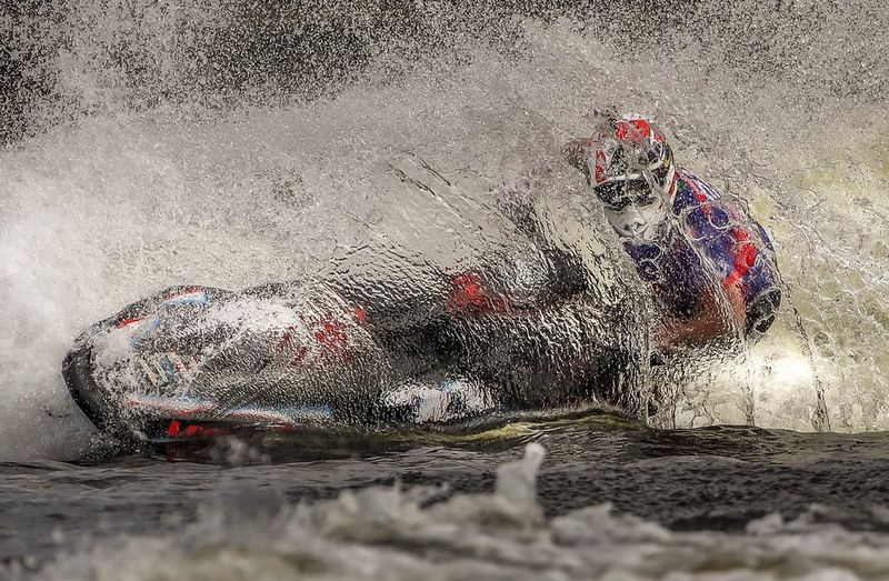 L'ambassadeur Canon Andrei Golovanov travaille en collaboration avec Sergei Kivrin, un confrère photographe russe. Il a photographié cette image en noir et blanc à l'atmosphère particulière d'un compétiteur pratiquant le flyboard pendant un championnat de hors-bord sur le lac Pirogov, en Russie. Photo prise avec un Canon EOS-1D X Mark II (désormais remplacé par le Canon EOS-1D X Mark III) équipé d'un objectif Canon EF 70-200mm f/2.8L IS III USM à 70 mm, 1/2500 s, f/5,6 et ISO 200. © Andrei Golovanov