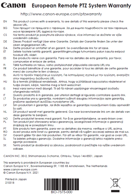 R : Vous n'avez pas besoin de renvoyer de documentation à Canon pour vous affilier à la garantie européenne applicable aux produits PTZ à distance. Si vous souhaitez spécifiquement demander une réparation couverte par la garantie européenne applicable aux produits PTZ à distance, vous devrez toujours fournir à Canon la preuve d'achat d'origine valide (avec la date d'achat d'origine) du produit en question.